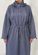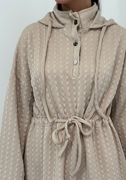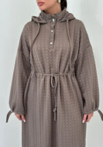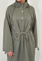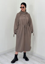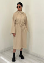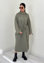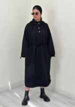 جنس پارچش لطیف و گرمه اصلا سایه نمیده و گرم پارچش بالاست کلاهداره دکمه های رو سینه باز میشه دو طرفش جیب داره و رو قسمت کمر هم بند تنظیم داره که به سایزتون میتونید تنظیم کنید