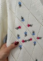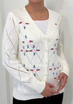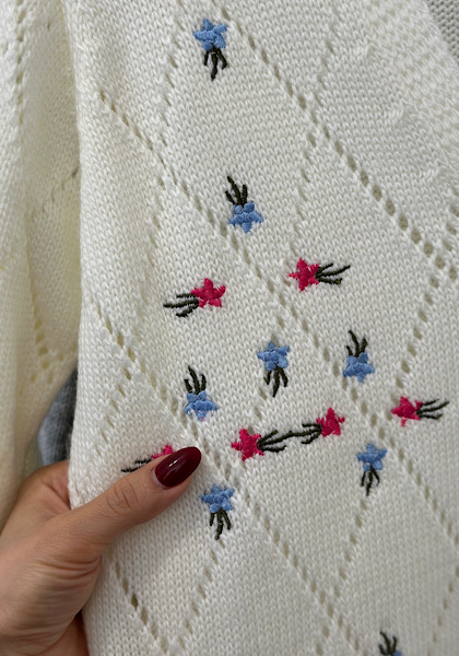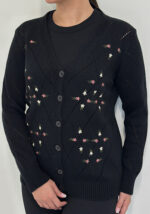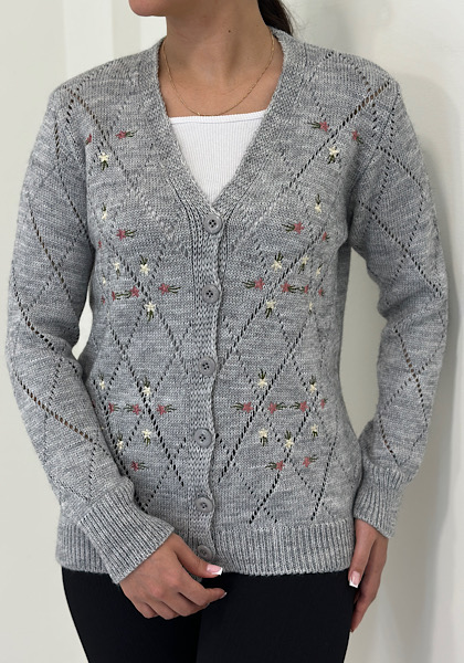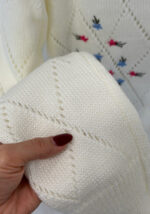 جنس بافتش لطیف و گرمه،طرح گل روی ژاکت گلدوزی هست و دکمه های جلوی ژاکت رو هم میتونید باز کنید